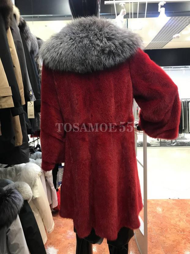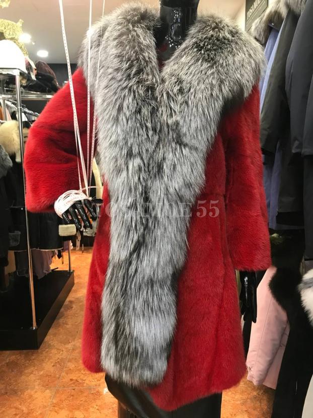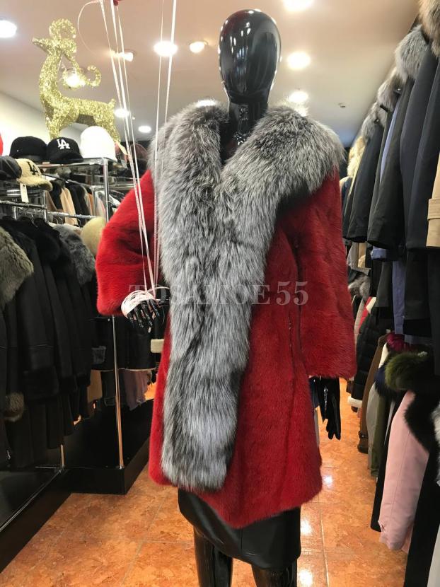Красная норковая шуба с отделкой из чернобурки